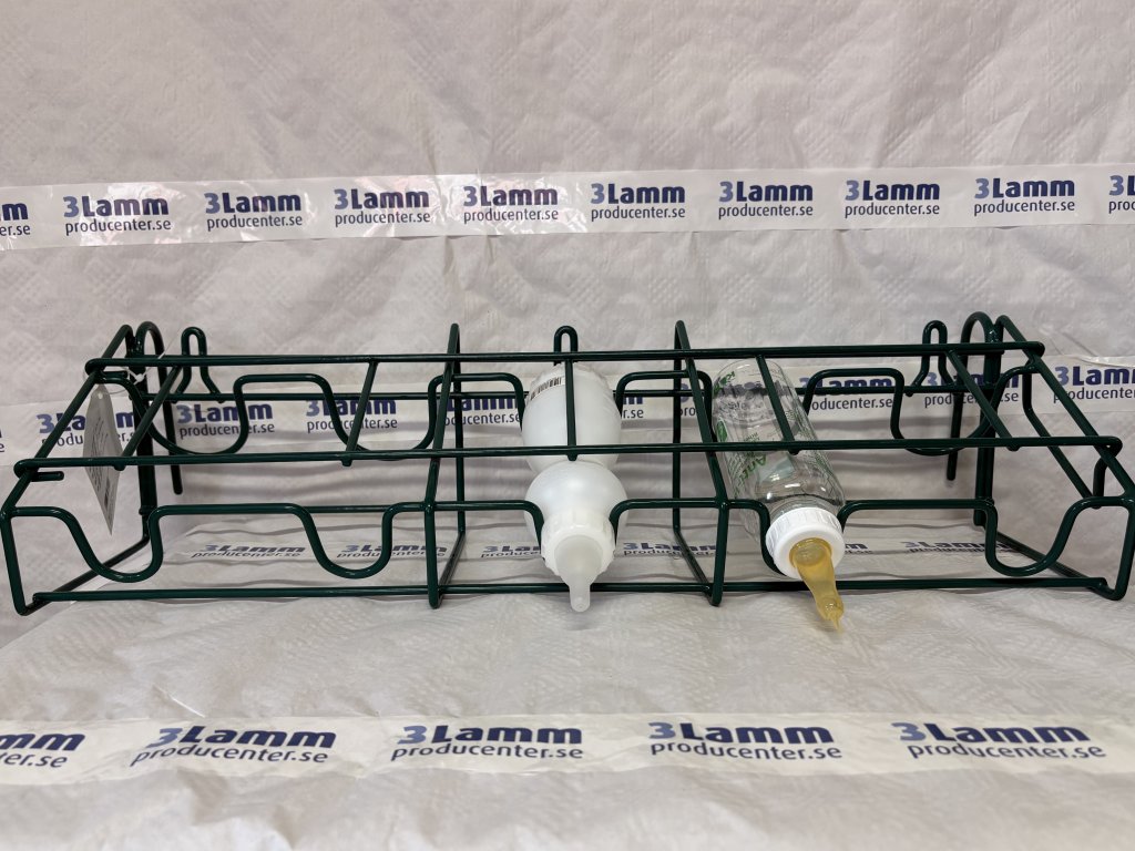 Ladda flaskorna med mjölk i mjölkrummet och ta med ut till lammen. Går lätt att hänga på grind eller skruva på vägg.